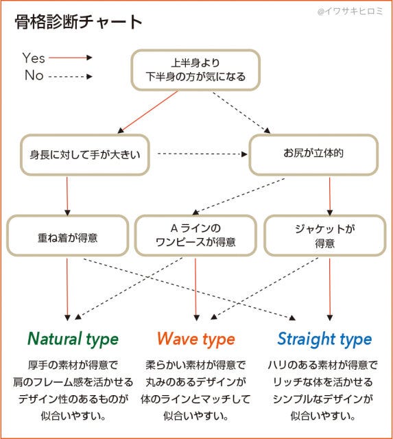 骨格診断とは、体の骨、筋肉、皮膚の質感などから似合う服のデザインやシルエット、素材がわかる診断です。似合うものを身につけることでスタイルアップが叶います。