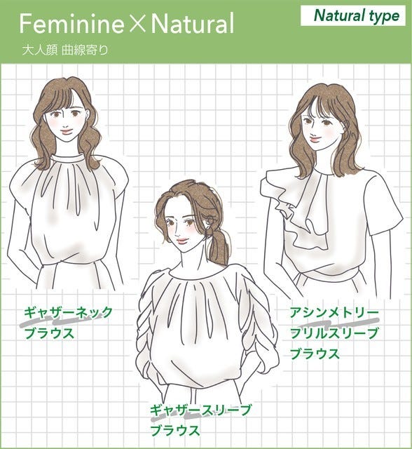 ・ギャザーネックブラウス:首元にたっぷりギャザーが入ったブラウスはナチュラルさんの骨感をカバーして華奢に見せてくれます。
