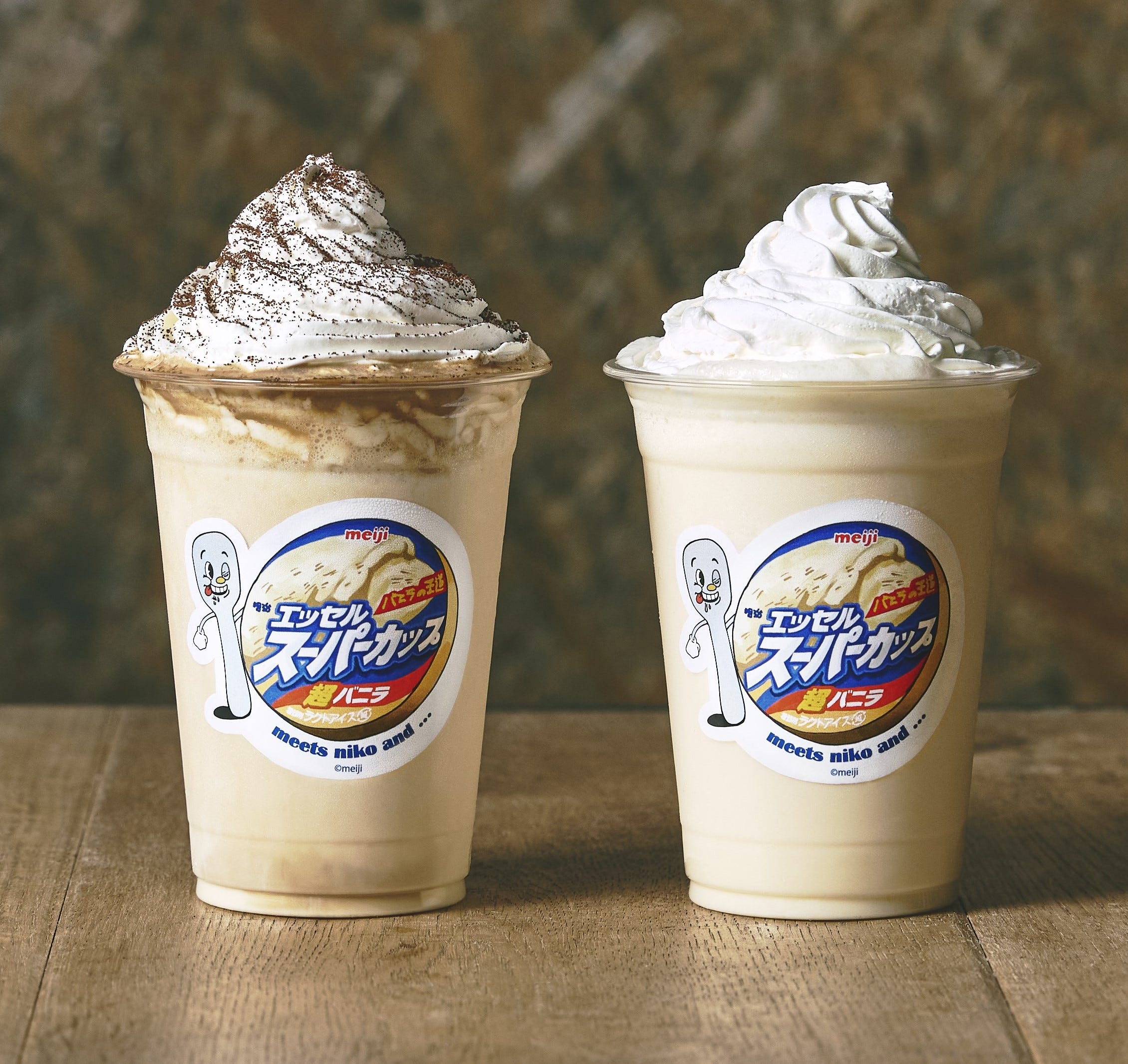 「明治 エッセル スーパーカップ スムージー」550円/フレーバー:コーヒー、バニラ 「niko and ... COFFEE」だけで展開するコラボドリンクは、“バニラアイスの王道”「明治 エッセル スーパーカップ 超バニラ」をまるごと一個使用したとっても贅沢なスムージー。“ニコアンドの王道”「ニコアンドコーヒーオリジナル エスプレッソ」を使用したコーヒーフレーバーも、期間限定で販売中。どちらのフレーバーを味わうか、これは迷ってしまいますね。