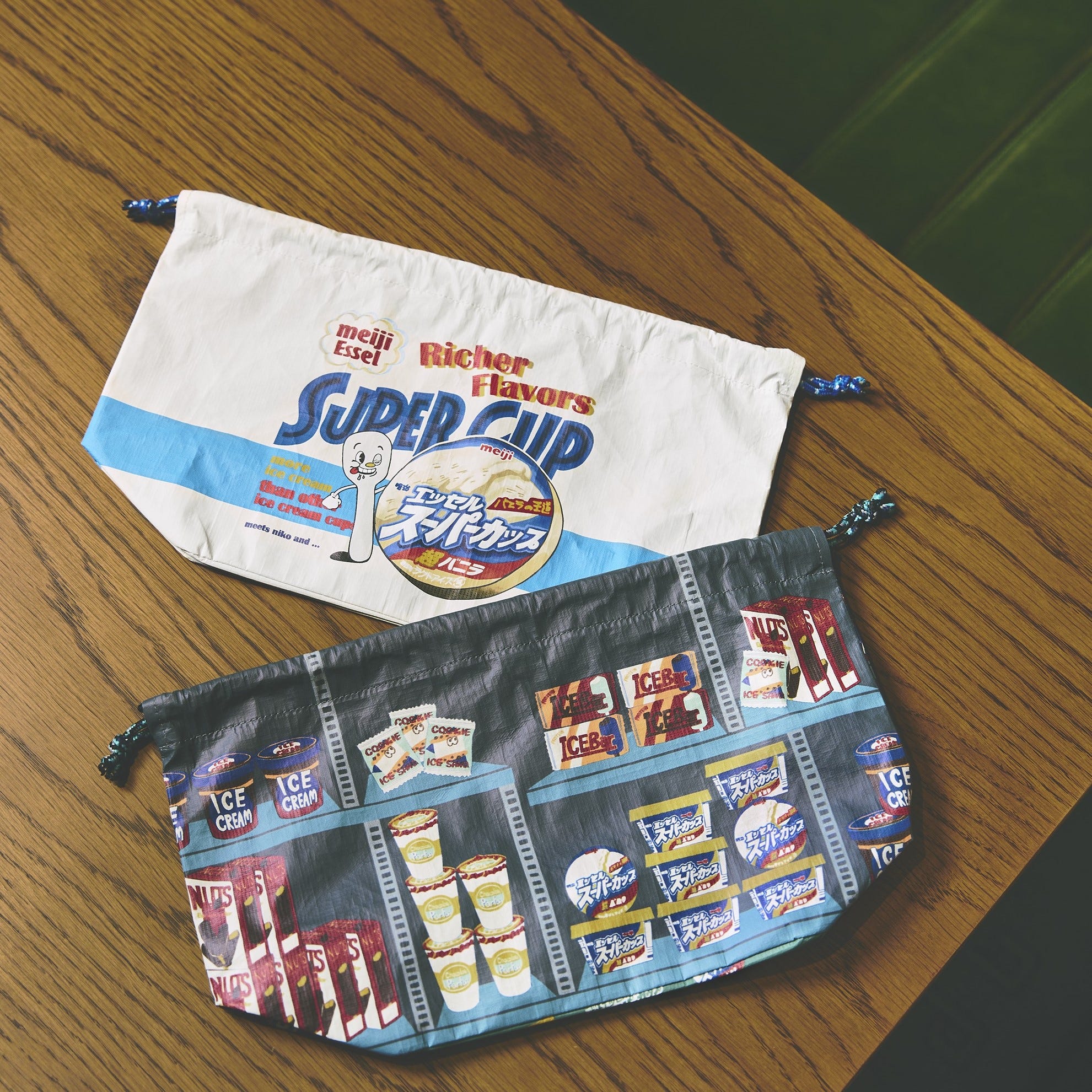 「巾着」各1,980円 コラボアイテムは、小物収納に便利な「巾着」や、ギフトにもおすすめの「タオルハンカチ」、「スマホショルダー」など、日々の生活にも取り入れやすいものばかり。「明治 エッセル スーパーカップ」のパッケージをユーズド感のあるアメリカンテイストで再現したユニークさもあり、ひとつ持っていると自慢できそう!