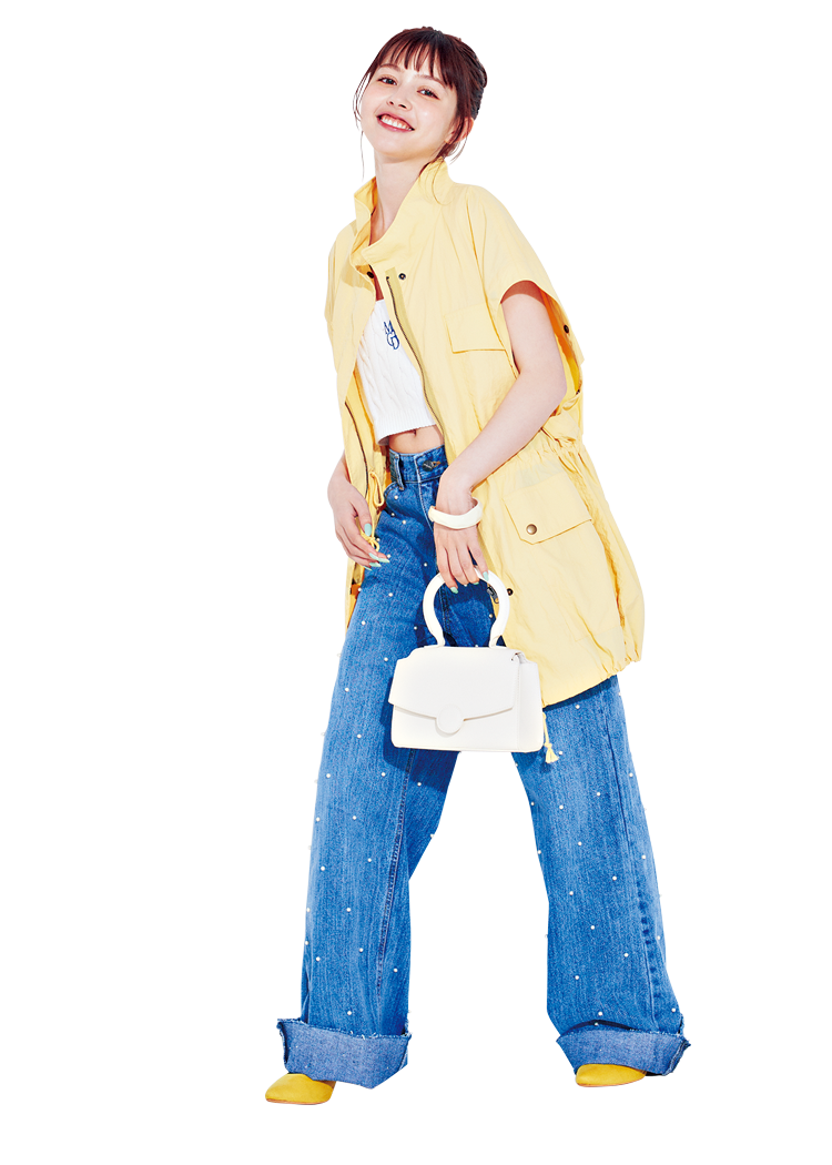 イエローナイロンブルゾンが印象的なコーデ。スポーティーなブルゾンを、クールなデニムで引き締めて、大人っぽさを演出。ミニ丈のインナーをあわせてトレンド感も◎。小物は白のアイテムでコーデに統一感を。
