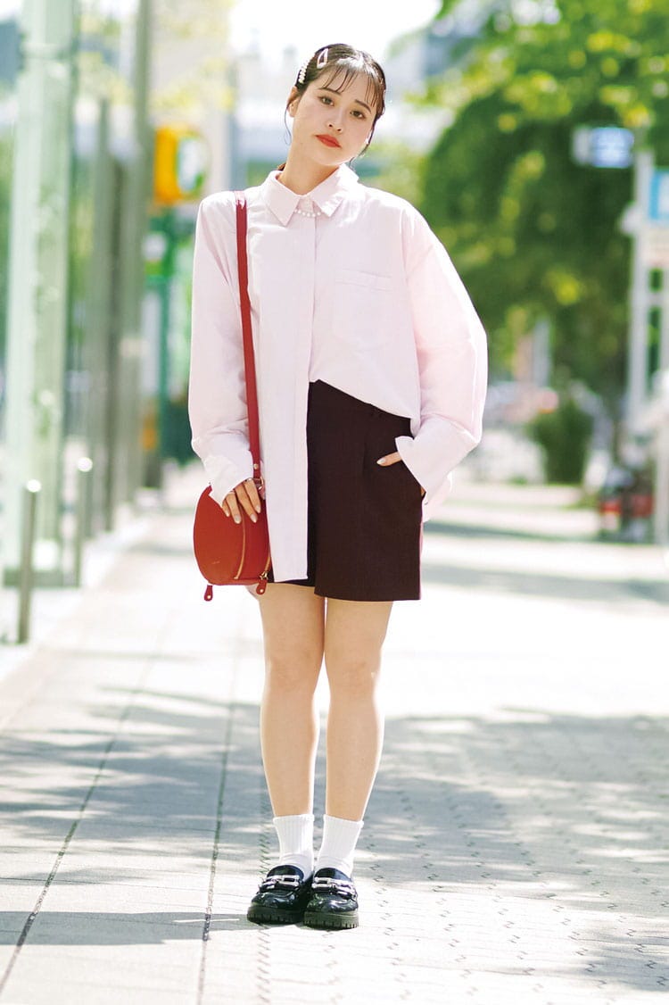 「ZARAで買った薄ピンクのシャツは約4,500円だったよ。ショーパンは約15,000円、ショルダーバッグは19,000円くらいで、どちらもJILL by JILL STUARTのもの。全体的に甘めなので足元はレザーにして、辛さをプラスしたよ」