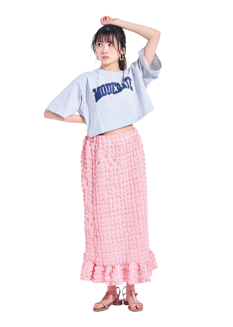 カジュアルなロゴTもフェミニンなピンクスカートで見ちがえる。ワッフル生地のスカートは注目を集めること間違いなし!