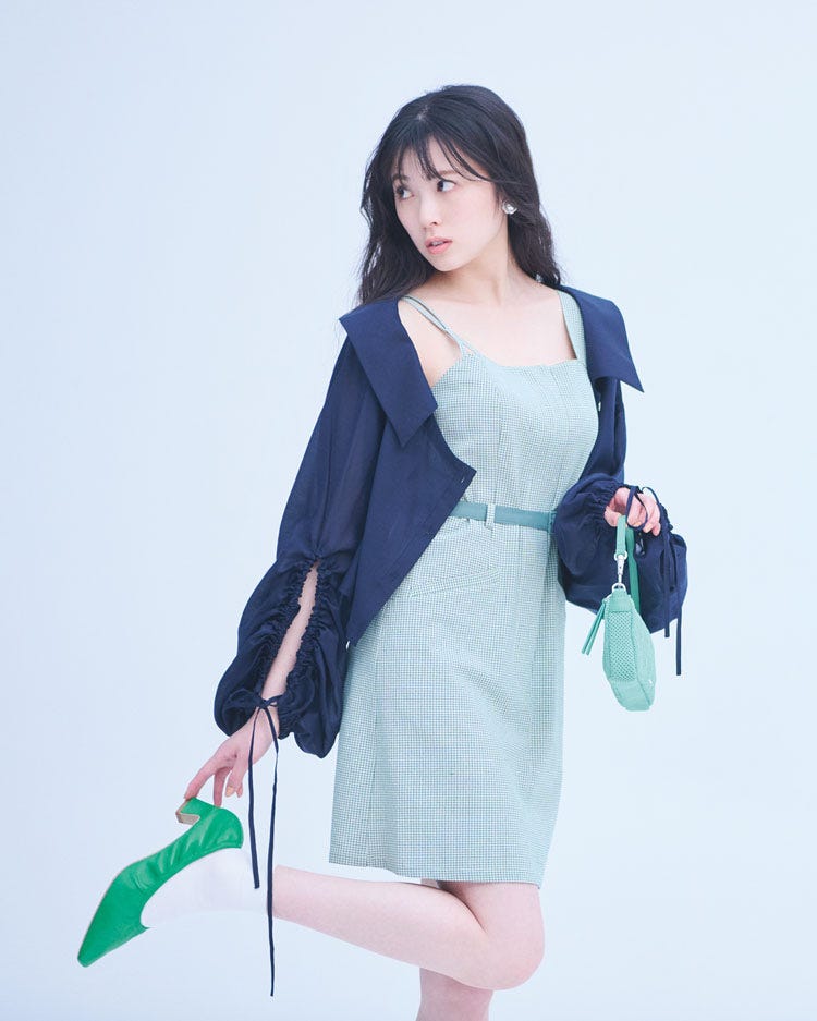ネイビーシアーシャツとベルトつきグリーンチェックワンピースのセット 14,960円/REDYAZEL ルミネエスト新宿店 イヤリング 1,210円/Osewaya(お世話や) 靴下 880円/靴下屋(Tabio) バッグ 9,900円/チャールズ&キース(チャールズ&キース ジャパン) パンプス 16,500円/ローズ バッド(ROSE BUD ルミネエスト新宿店) Coordinate3 ブラウン×ビビッドカラー