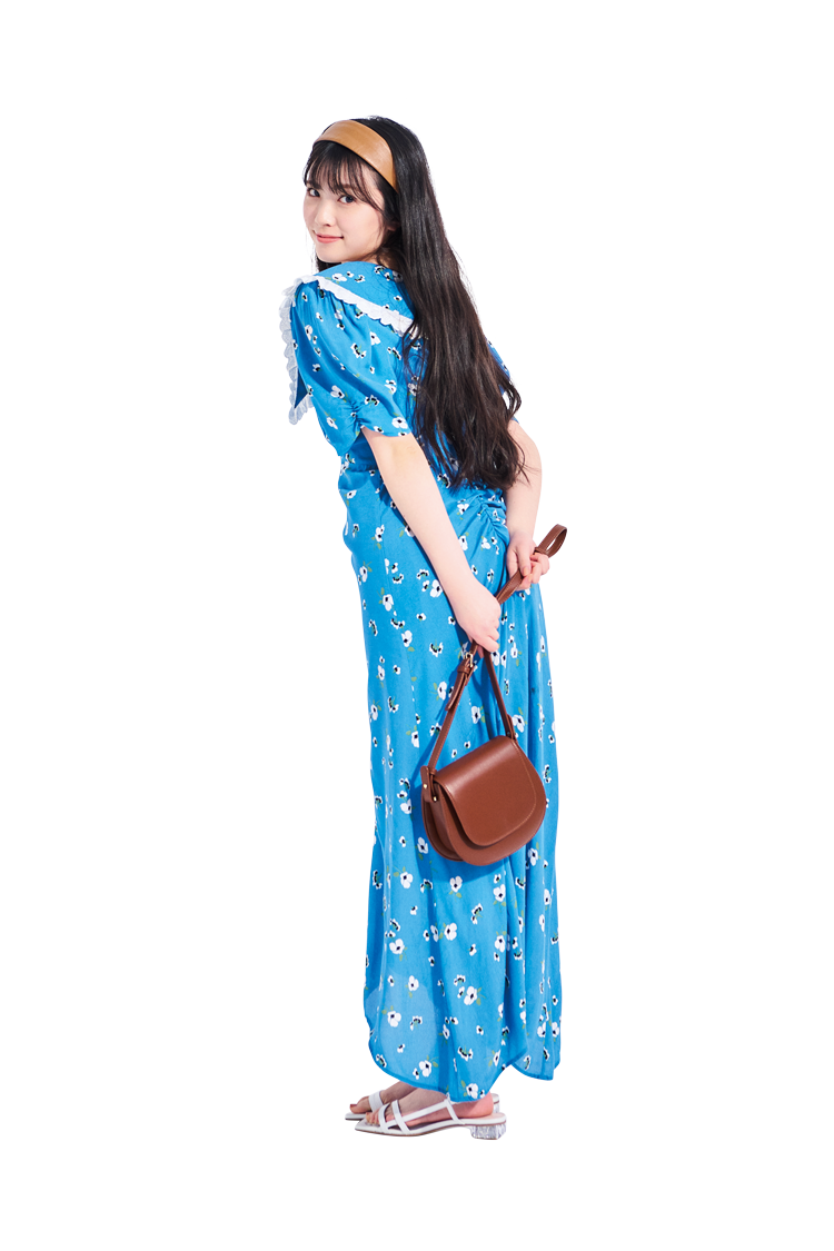 ブルー花柄ワンピース 16,500円/The Girls Society カチューシャ 18,700円/ジェニファーオーレット(THE HAIR BAR TOKYO) バッグ 5,290円/Isn't She? サンダル 15,950円/ダイアナ(ダイアナ 銀座本店) Coordinate4 ピンク×グレー