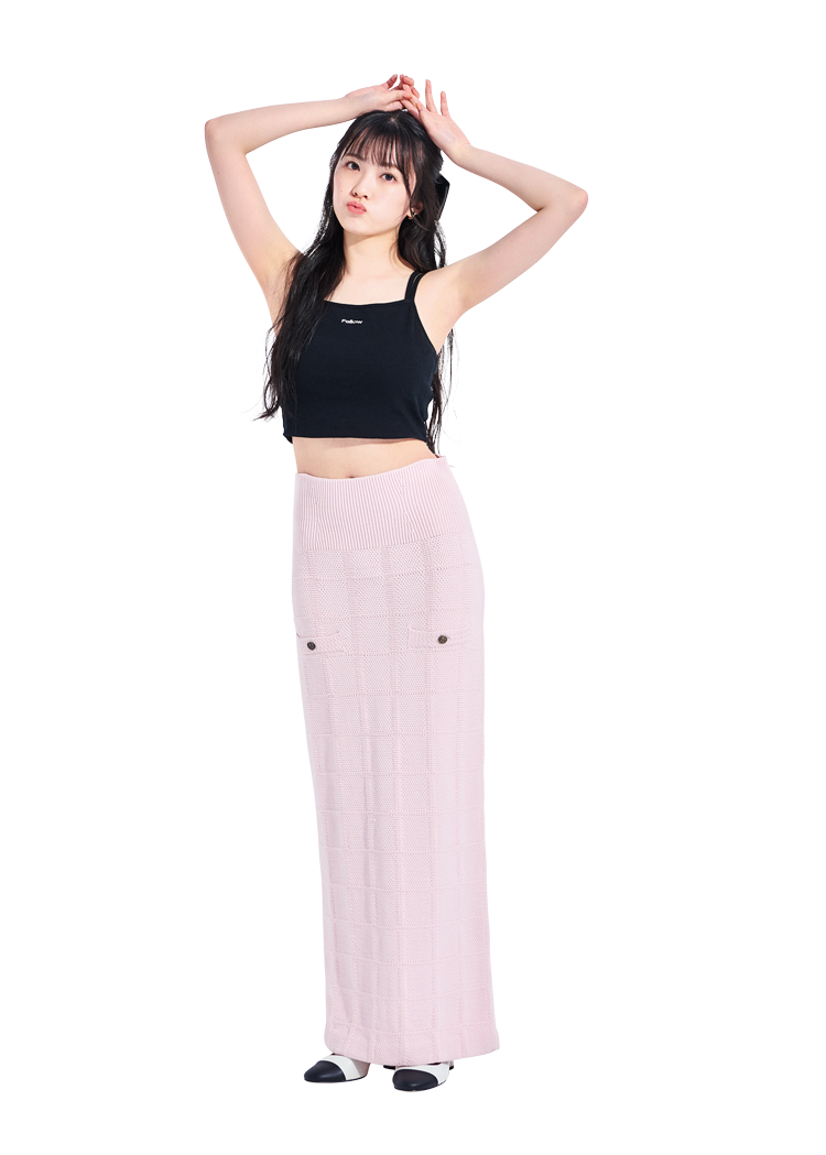 黒ロゴキャミソール 2,199円/WEGO ピンクツイードライクニットロングスカート 14,960円/SNIDEL イヤリング 1,650円/Osewaya(お世話や) パンプス 8,200円/チャールズ&キース(チャールズ&キース ジャパン)その他/スタイリスト私物 Coordinate2 モダンなグリーン×ネイビー