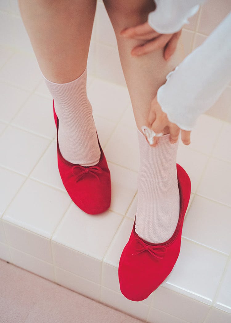 Item1 バレエシューズ おしゃれは足元から。ソックスと靴のグラデを楽しむ上級テクは意外とカンタン♡ オーロラピンクリブ靴下 1,100円/靴下屋(Tabio) バレエシューズ 15,950円/moumoune 白シースルータートルトップス 2,750円/スピンズ 白ニットショートパンツ 6,490円/LILLIAN CARAT(リリアン カラット) カチューシャ 69,300円/ジェニファーベア(THE HAIR BAR TOKYO) ハートリング
