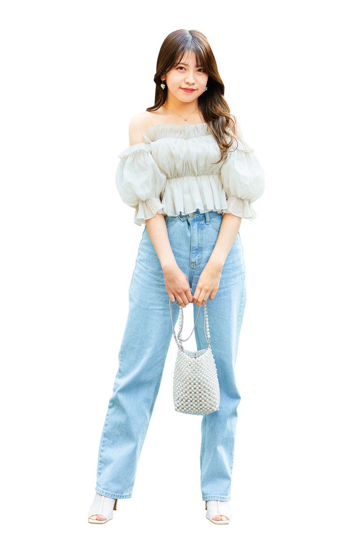 ロマンティックなトップスはデニムでちょうどいい甘さに調整。