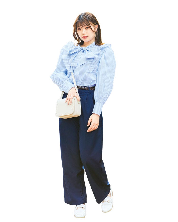 「こんなボリューミーなリボンは他にない!約3,500円だったINGNIのブラウスとパンツはワントーンコーデで今っぽく。約2,500円のHoney’sのローファーをあわせれば、キレイめコーデの完成」