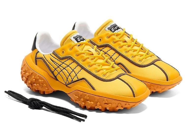 協業シューズは同ゲームのために特別に開発し、左足のかかと部にはオニツカタイガー、右足のかかと部にはストリートファイターのロゴをあしらった。アウターソールがセパレートになったラギットな印象のソールやスクエアのつま先形状、ステッチで表現されたオニツカタイガーストライプなどディテールにこだわった。カラーは黄色系とグレー系の2色。税込み2万7500円。