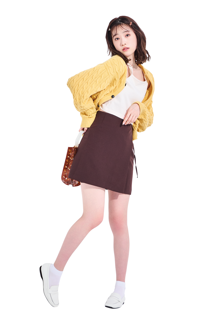 目を惹くイエローカーデでハッピーオーラ満載♡ 濃いブラウンは明るいカラーとあわせてスカートの重い印象を脱出。ミニ丈だからスタイルアップ効果も◎。しっかり映えるカラーでみんなに印象づけちゃお!