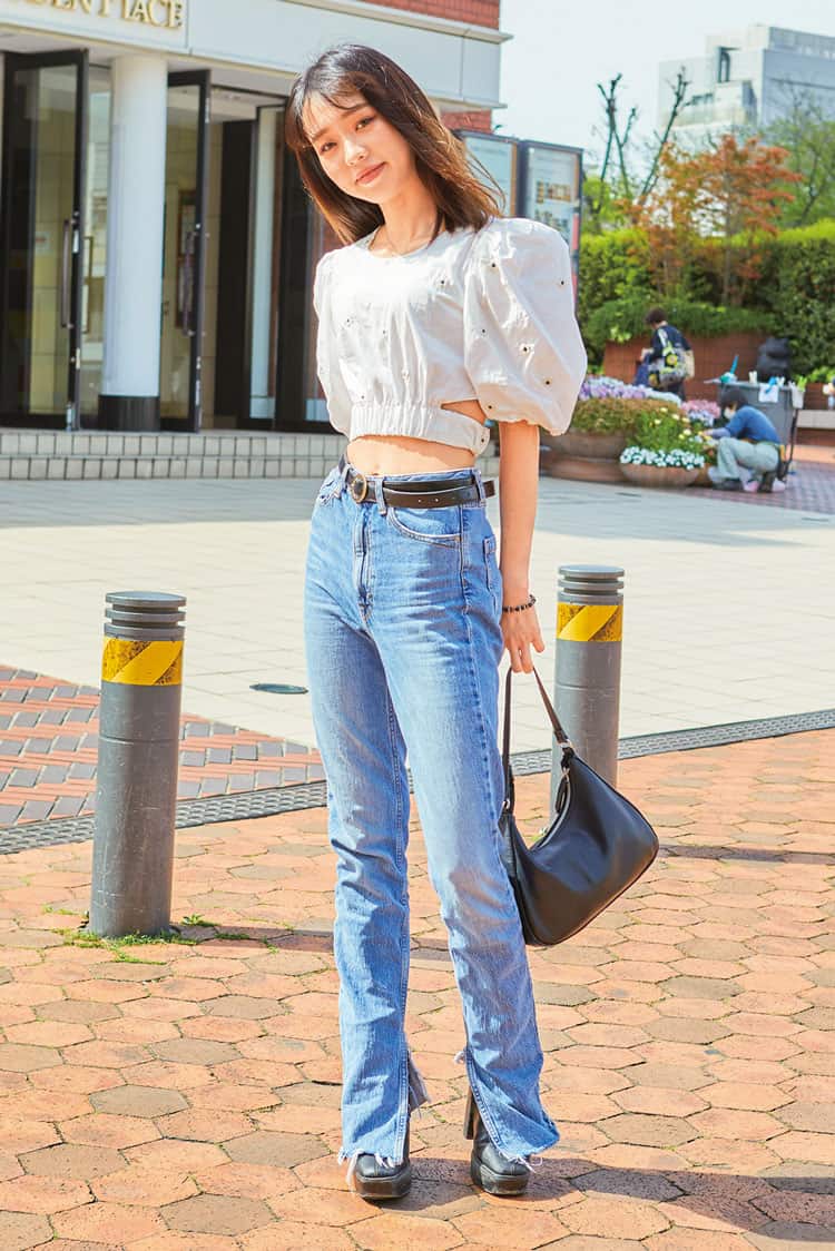 東京ではおなか見せな短丈トップスを着こなす高感度ガールがちらほら♡ ハイウエストパンツで露出をおさえるのが、しゃれ見えの理由でした!