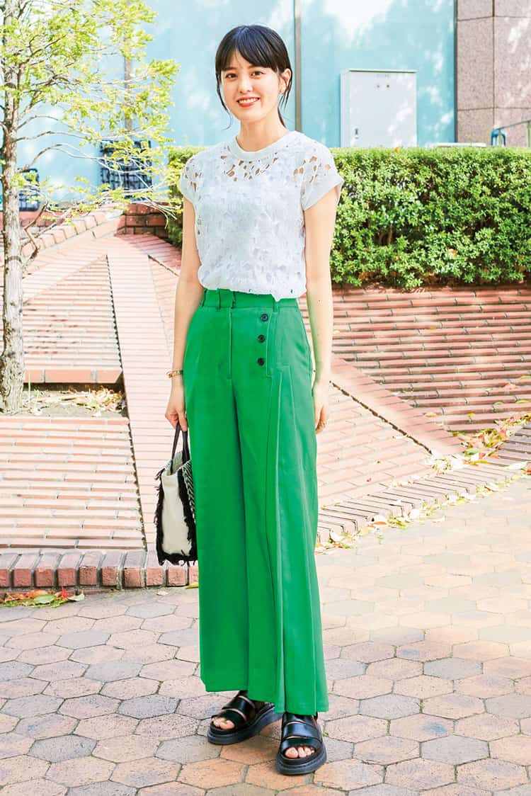 「約10,000円のUNITED TOKYOのパンツはスタイルアップも叶えてくれる優秀アイテム。メンズライクな色でもあるから、あわせるトップスはレースなどレディライクなデザインで甘さを意識するのがマイルール」