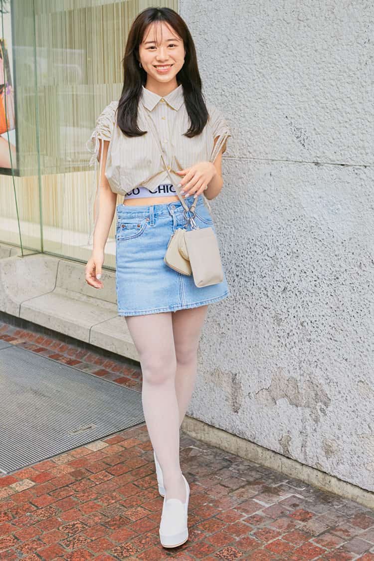 「重ねたときにロゴが見えるように、タンクを仕込んでみました♡ シャツもタンクもChicoのもので、2着で12,000円くらい。BEAMSのデニムスカートは女性らしいタイトシルエットが今の気分にぴったりです♡」