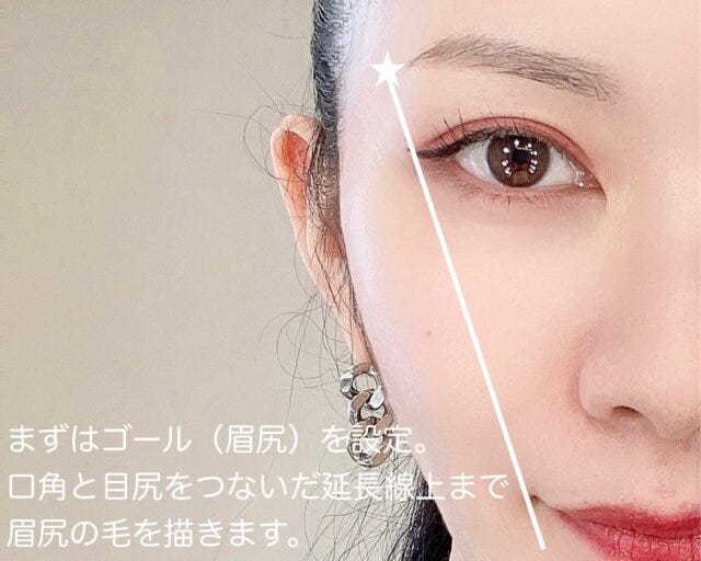 口角と目尻の延長線上に眉尻を設定したら、眉山下~眉尻に1本ずつ毛を描いていきましょう。