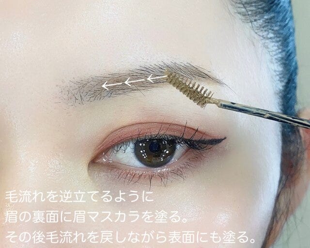 一度毛流れを逆立てるように塗ってから、毛表面に塗ると自眉の黒さをしっかりカバーすることができます。