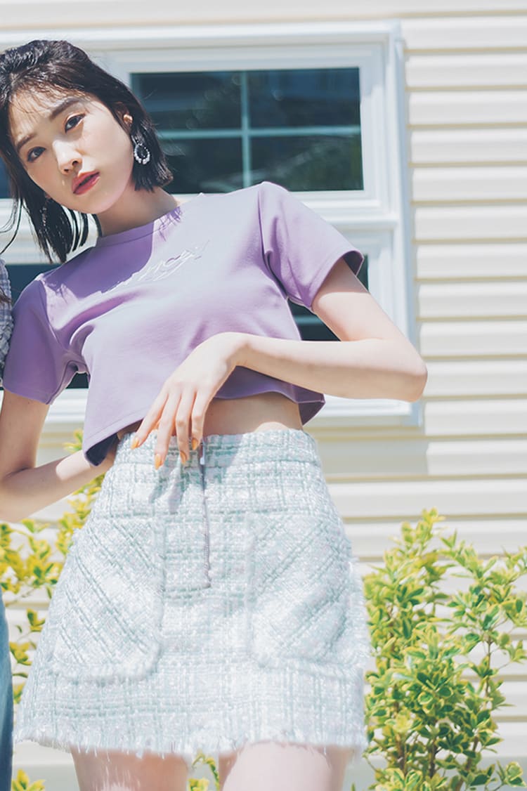 パープルTシャツ 7,700円/eimy istoire ルミネエスト新宿店 グリーンツイードスカート 5,590円/ZARA(ザラ) ピアス 5,500円/Mel cinna Item4 ラタンかごバッグ