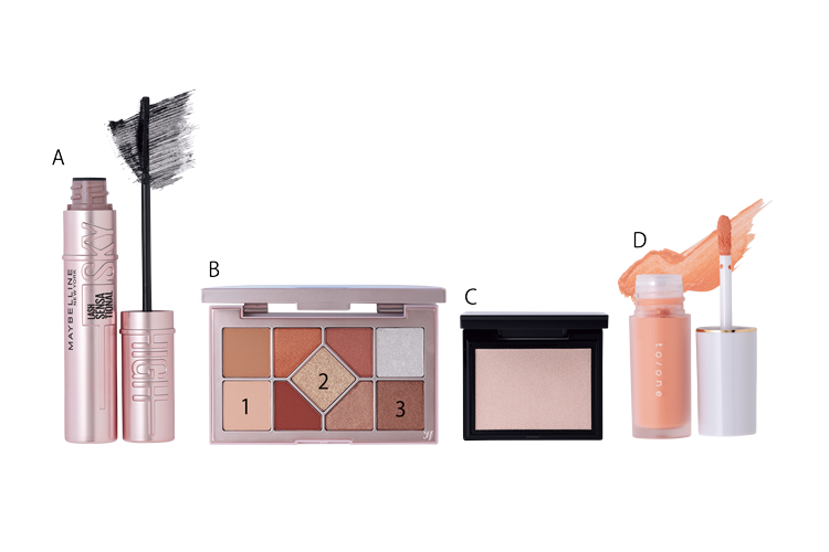 盛りに盛ったぶん、まぶたはヌーディに抜けを作ったり、リップはミルキーなオレンジで甘くふったりとバランスをとるのがコツ。