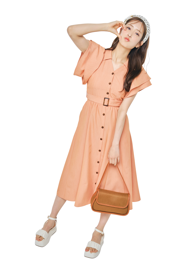 鮮やかなオレンジが印象的なワンピコーデ。袖のフリルやハイウエストなベルトで体形カバーやスタイルアップ効果が期待できます。カチューシャやサンダルはシンプルにまとめ、ワンピを目立たせて!お出かけにピッタリな、写真映えすること間違いなしのコーデに仕上げました。