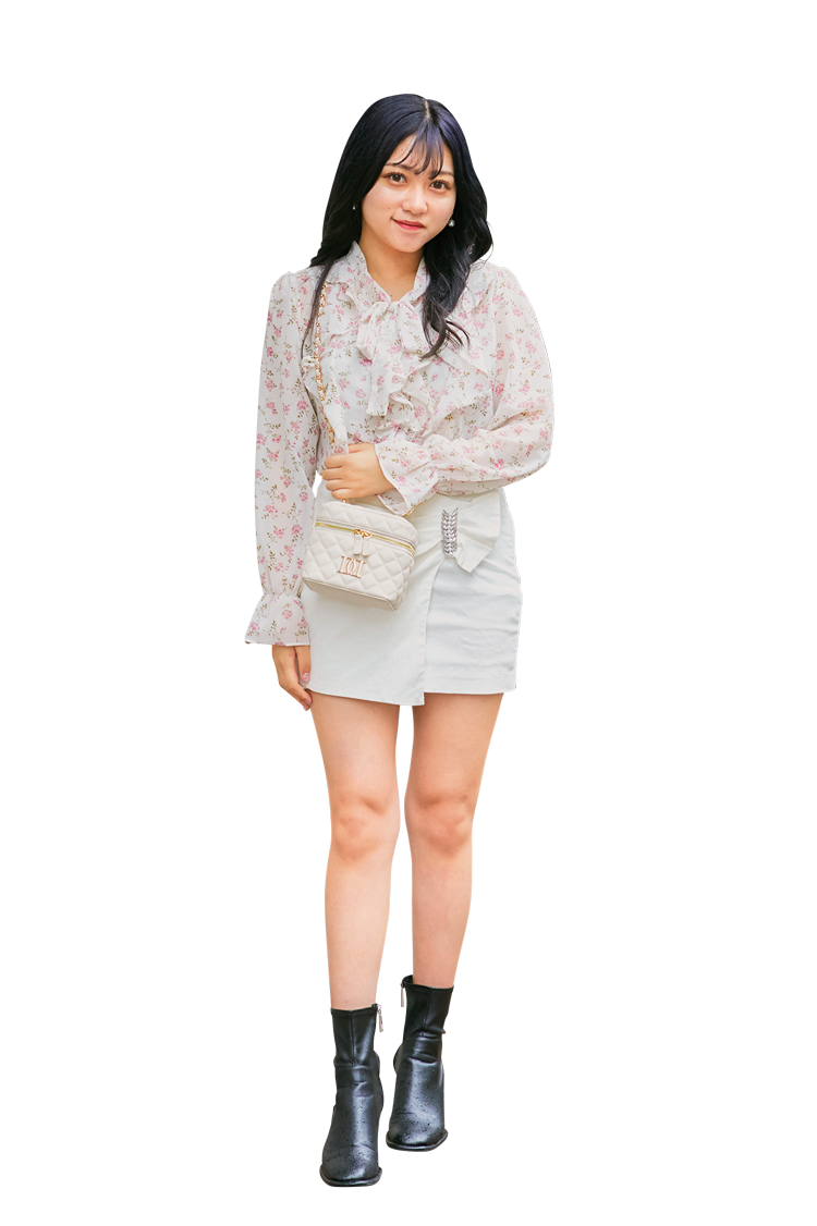 「約7,000円のフリルブラウスと約9,000円の花柄スカートはどちらもWILLSELECTIONのもの。布感たっぷりなスカートは歩くと揺れて、ドラマティック。FENDIのバッグで大人っぽさに磨きをかけてみました」