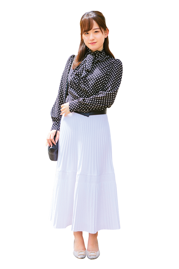 「女性らしくてエレガントな雰囲気が好きなので、今日もクラシカルなモノトーンコーデに。allurevilleのブラウスは約24,000円、プリーツスカートは40,000円くらい。ヒールだけど歩きやすいDIANAがお気に入りです」