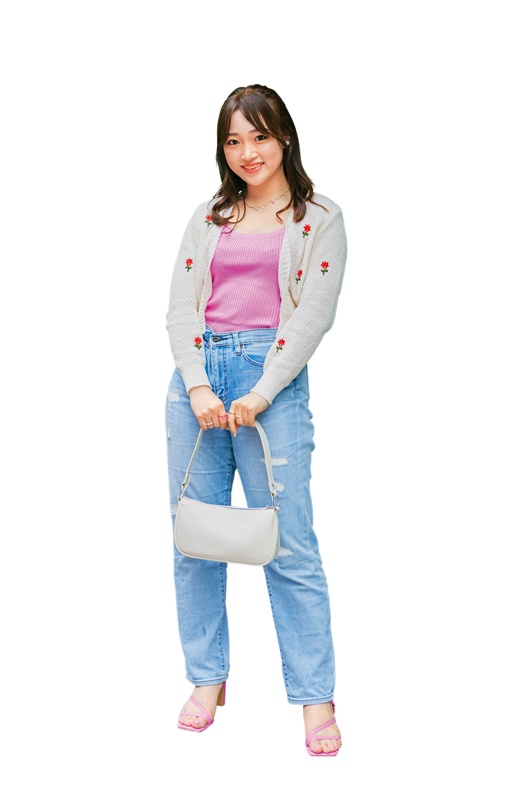 「韓国で買った花の刺しゅうのカーディガンはたぶん1,100円くらい。ぷっくりしたお花がお気に入り。ダメージジーンズはUNIQLO。タンクとバッグ、サンダルはH&Mのもの。実は全身1万円以下のプチプラコーデなんです」