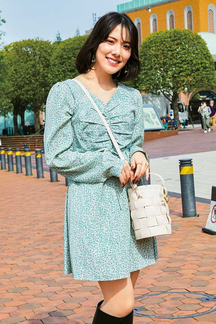 「シャーリングワンピースはDHOLICのもので約3,500円。緑には挑戦したことがなかったけど王道の花柄ならカンタンそうで挑戦しました!」