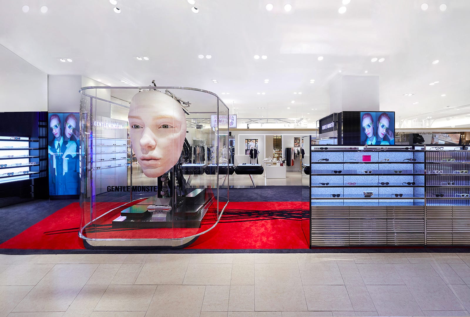 「ジェントルモンスター 阪急うめだ本店」を訪れてまず驚くのは、店頭に飾られたジャイアントヘッドのキネティックオブジェ。実はこちら、動きます! 韓国のストアやブランドの空間デザインは非常に注目されていますが、「ジェントルモンスター」の唯一無二のクリエイティブな空間の演出は日本でも健在。アイテムの独創性だけでなく、いろいろな刺激に満ちています!