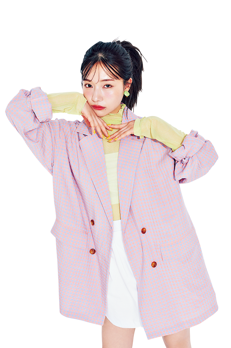 華やかな印象のカラフルコーデ。ピンクが主役のジャケットに、あえて派手なライムグリーンを投入することで誰よりも目立っちゃお♡ ショート丈パンツで脚長効果も抜群◎。重くなりがちなジャケットは、淡色を意識して軽い印象をメイク!