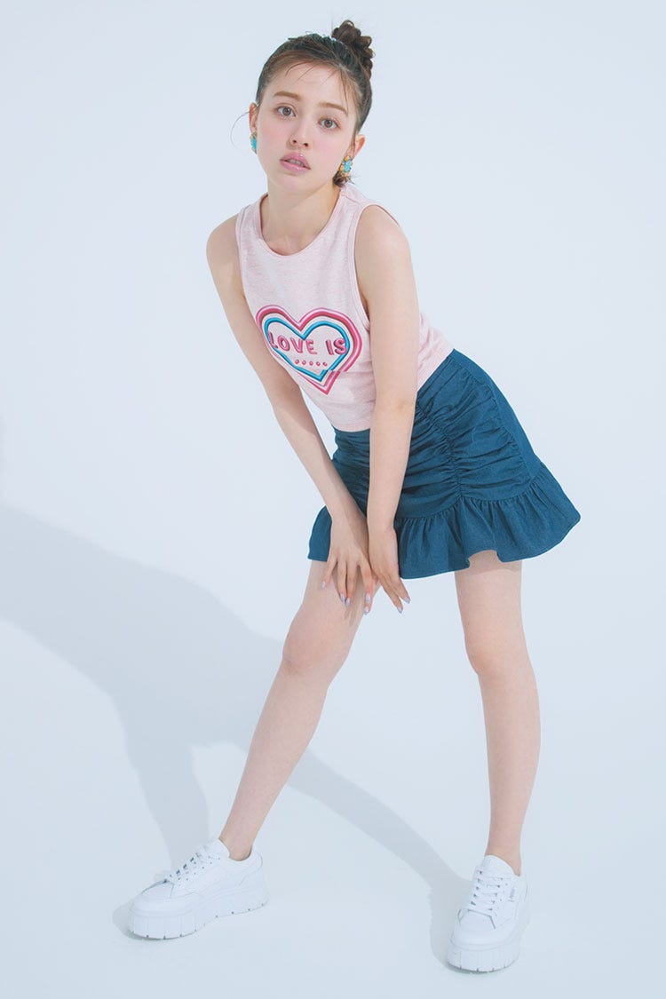 シルエットが可愛いミニスカを使ったコーデ。タンクトップやスニーカーのスポーティスタイルに、ギャザーやフリルのデザインが印象的なスカートをあわせてガーリー要素をプラス。小顔効果も期待できる大きめイヤリングで顔まわりを華やかに♡