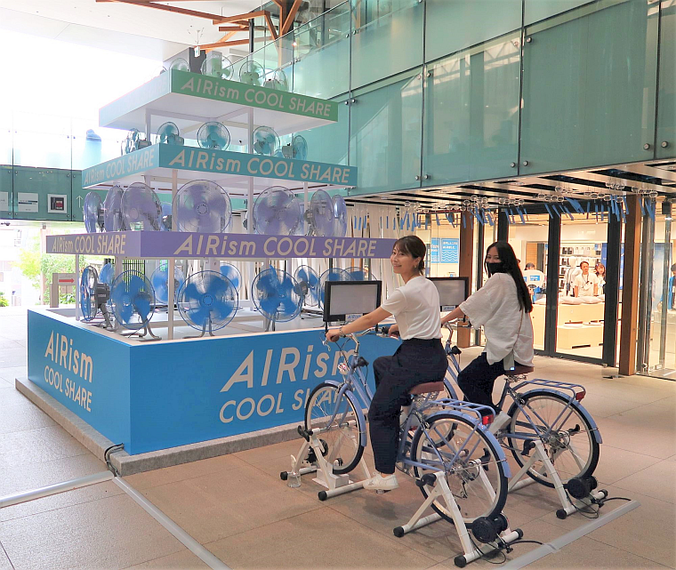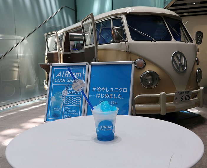 ほかにも自転車をこいで動かす扇風機タワーや、風鈴とエアリズム素材の短冊をつるしたカーテンを設置し、かき氷も販売する。イベント中は赤を使ったユニクロのボックスロゴをエアリズムのキーカラーの青に変える。