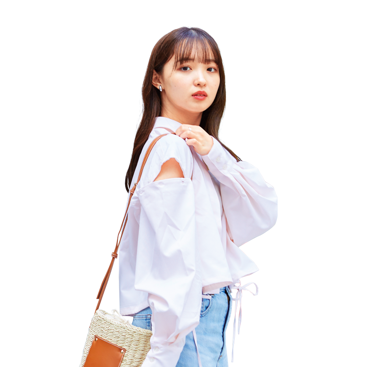 「GRLのカットオフシャツとINGNIのスカートで女みムンムンコーデが完成。実は2着で約6,000円のプチプラ服なんです。FURLAのバッグやCARLES&KEITHの靴など小物にこだわるのが高見えのコツ」