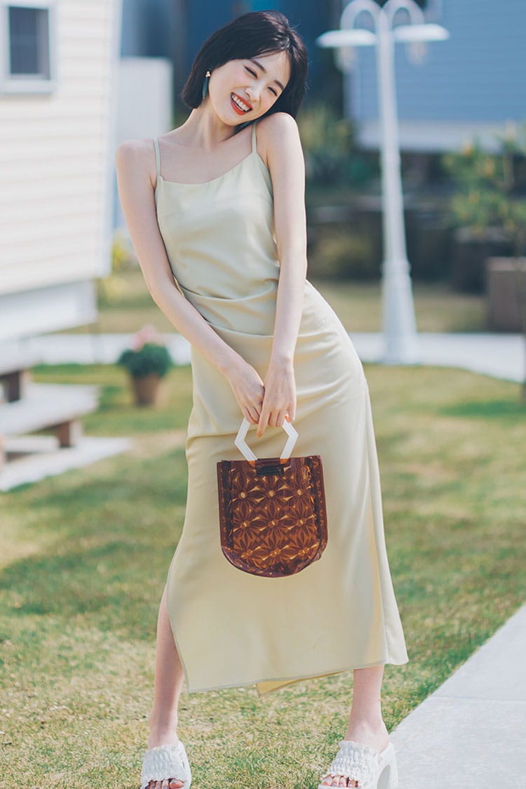 ドレッシーなキャミワンピを使ったコーデ。グリーンのサテン素材で上品な印象を演出。縦のシルエットを強調して、華奢見えも叶えます。デザイン性のあるバッグやミュールをあわせて、おしゃれ上級者感のあるコーデに♡