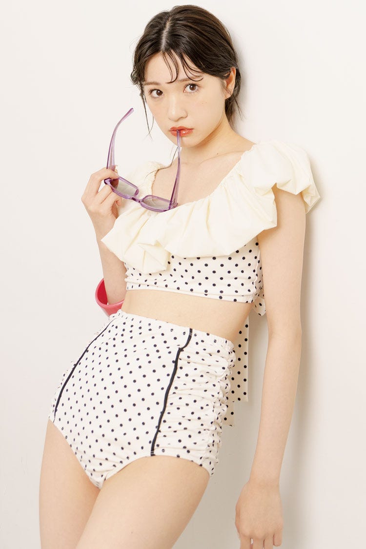 胸元のフリルが上半身をきゃしゃ見えさせる。程よい甘さの白ドットで愛らしさを演出!