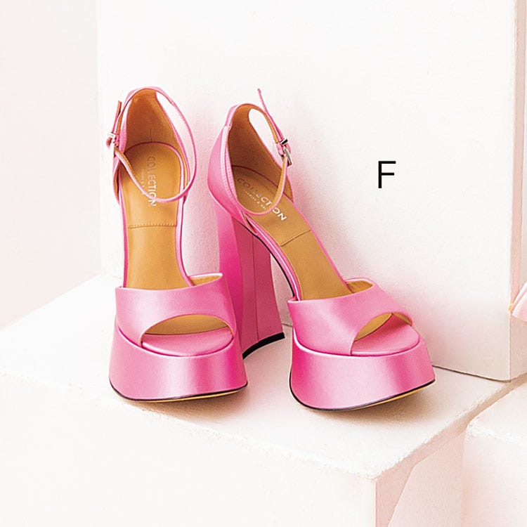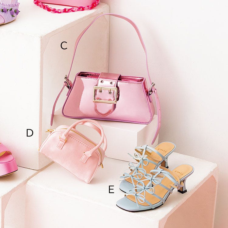 【C】ピンクオーロラショルダーバッグ(12×22×5.5)5,990円/NADIA FLORES EN EL CORAZON【D】パステルピンクハンドバッグ(ショルダーつき)(10.5×16×5.5)4,990円/MANGO(LOCONDO)【E】ブルーリボンサンダル(6)12,090円/NADIA FLORES EN EL CORAZON Pick up3 ピンクアンクルストラップサンダル バービーちゃんみたいな超ド級のガーリー靴。14㎝のヒールは足長効果も抜群!コーディネートの主役にぴったりなフェミニンサンダルで足元から女度アップさせちゃおう♡
