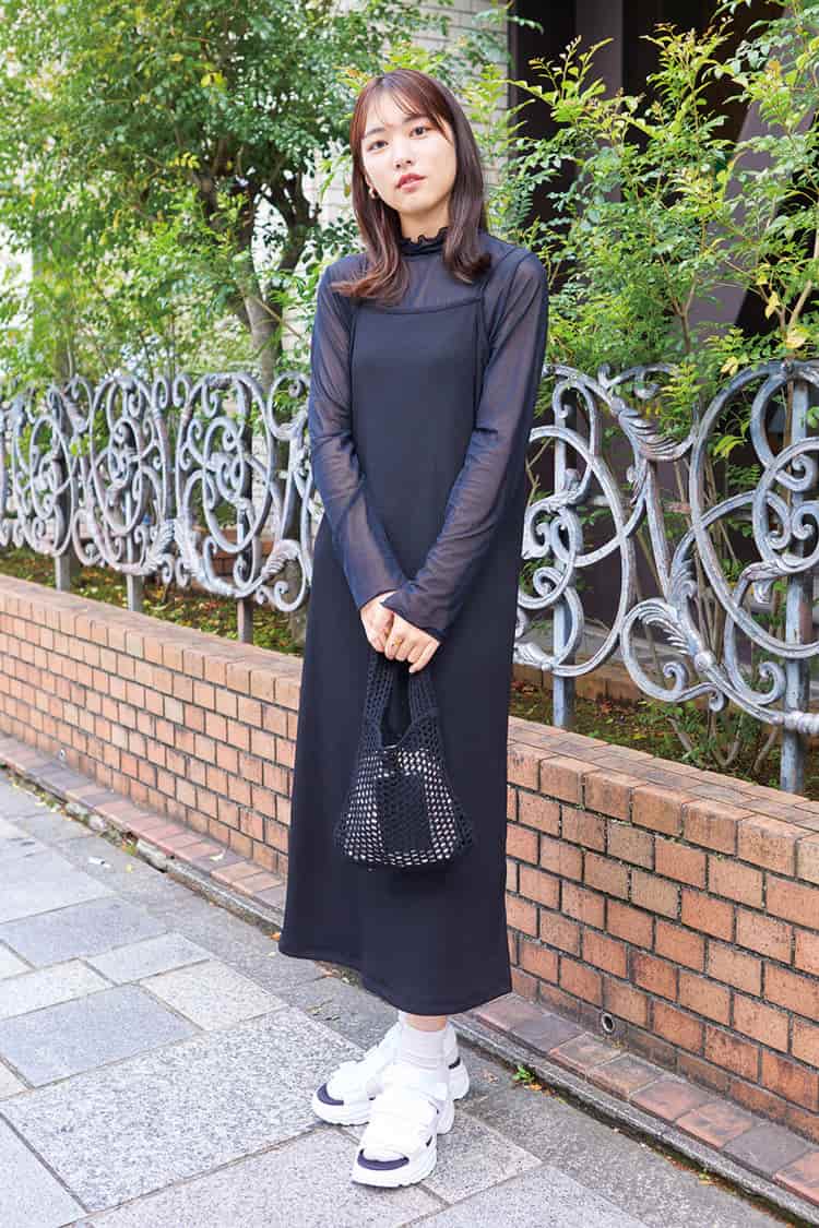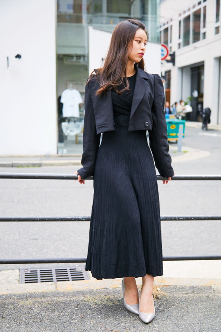 「最近は黒にハマっています。ウエストのくびれが強調されて女性らしく見えるワンピはGRLで約3,000円で購入。高見えするところが気に入ってます。流行りのショート丈のジャケットでさらにスタイルアップ狙い!」