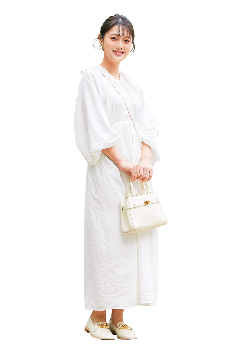 「ウエストの高い位置にギャザーが入っているので、白だけどスタイルよく見せてくれます。これはLouereで7,000円くらいでした。すそがふわっとしているので、野暮ったく見えないように髪型はおだんごでスッキリと♡」