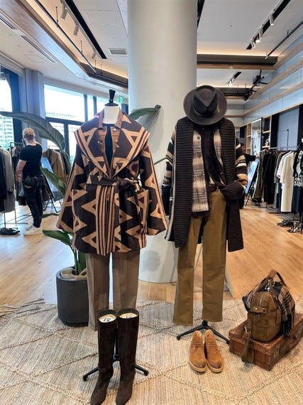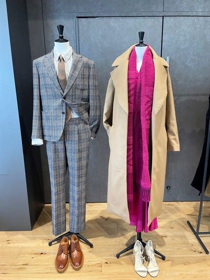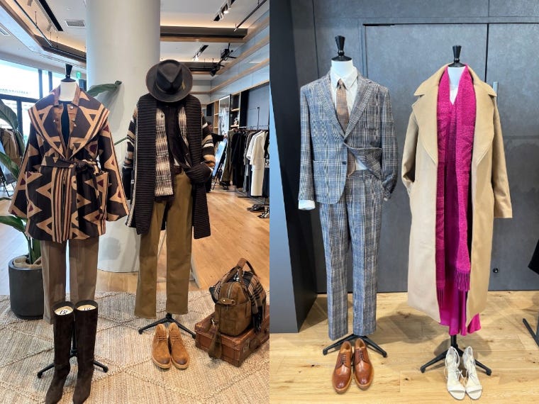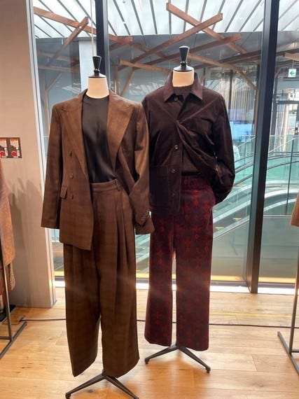 9月はスーツやシルクのシャツ、カシミヤやウールのニットアイテムを使ったきれいなコーディネートを組んだ。ウィメンズはドレープが女性らしさを演出するシルクのブラウスやジオメトリック柄のウールコート、ツイードスーツなど。メンズはフランネルやコーデュロイ、ツイードのスーツを企画した。