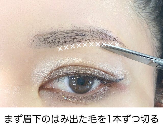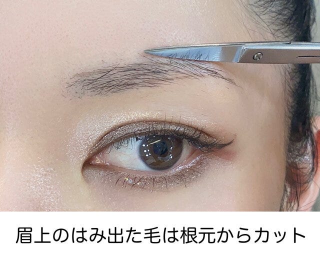 眉上のガイドラインからはみ出た毛は、1本ずつ根元からしっかりカットを。