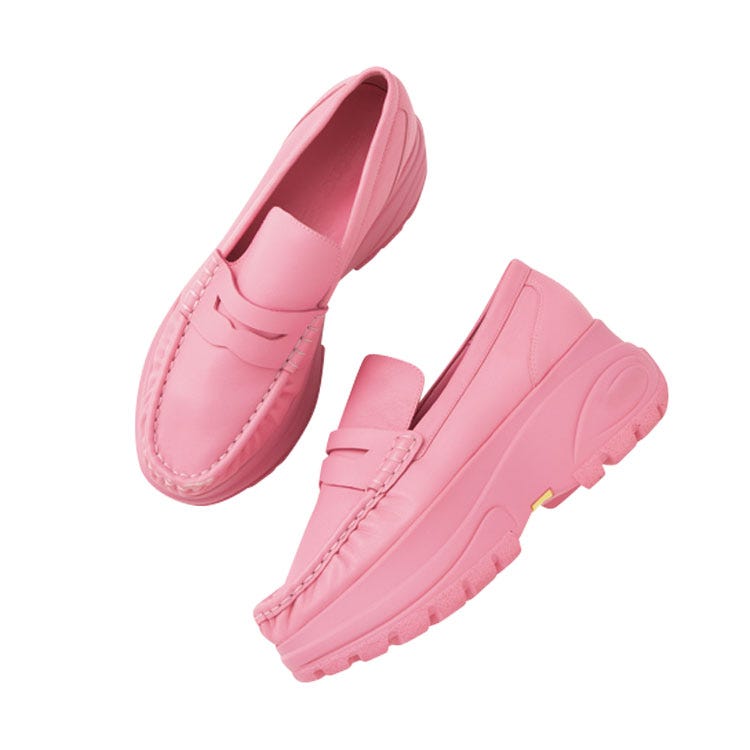 走りまわれるスニーカーチックなソールがありがたい。優等生なローファーをド派手ピンクでハズす◎。
