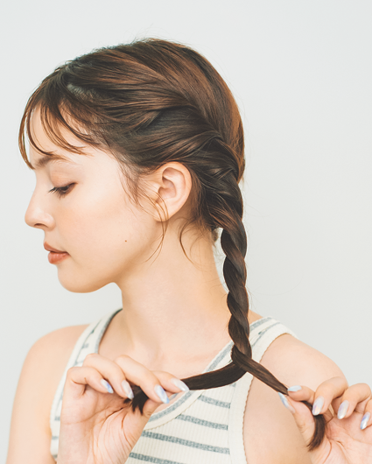 耳後ろまで編み込んだら、後頭部で半分に分けておいた左側の残りの髪を1の編み束にあわせ、毛先までねじっていく。くずれにくくするために、ねじるときはできるだけタイトに。