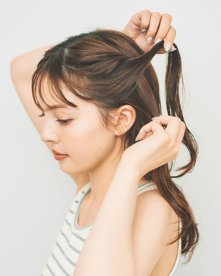 髪全体を後頭部で2つに分けておく。左側の顔まわりのハチ上の髪をとり2つにさいてねじる。次にねじり部分の下の髪を足して再度ねじる。これを繰り返して、ねじり編み込みに。