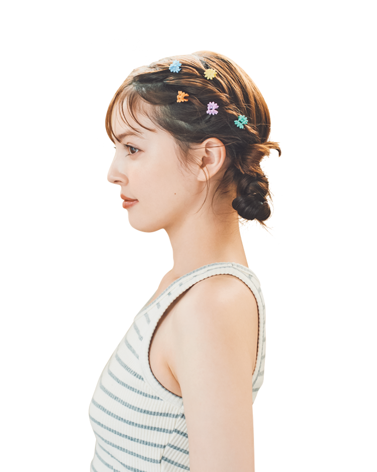 小さいのがたくさんが可愛いちびクリップY2Kみのあるちびクリップは、たくさん盛ったぶんだけ可愛くなる。ダウンスタイルもいいけど、おだんごにあわせるとPOPで夏感が増すよ!