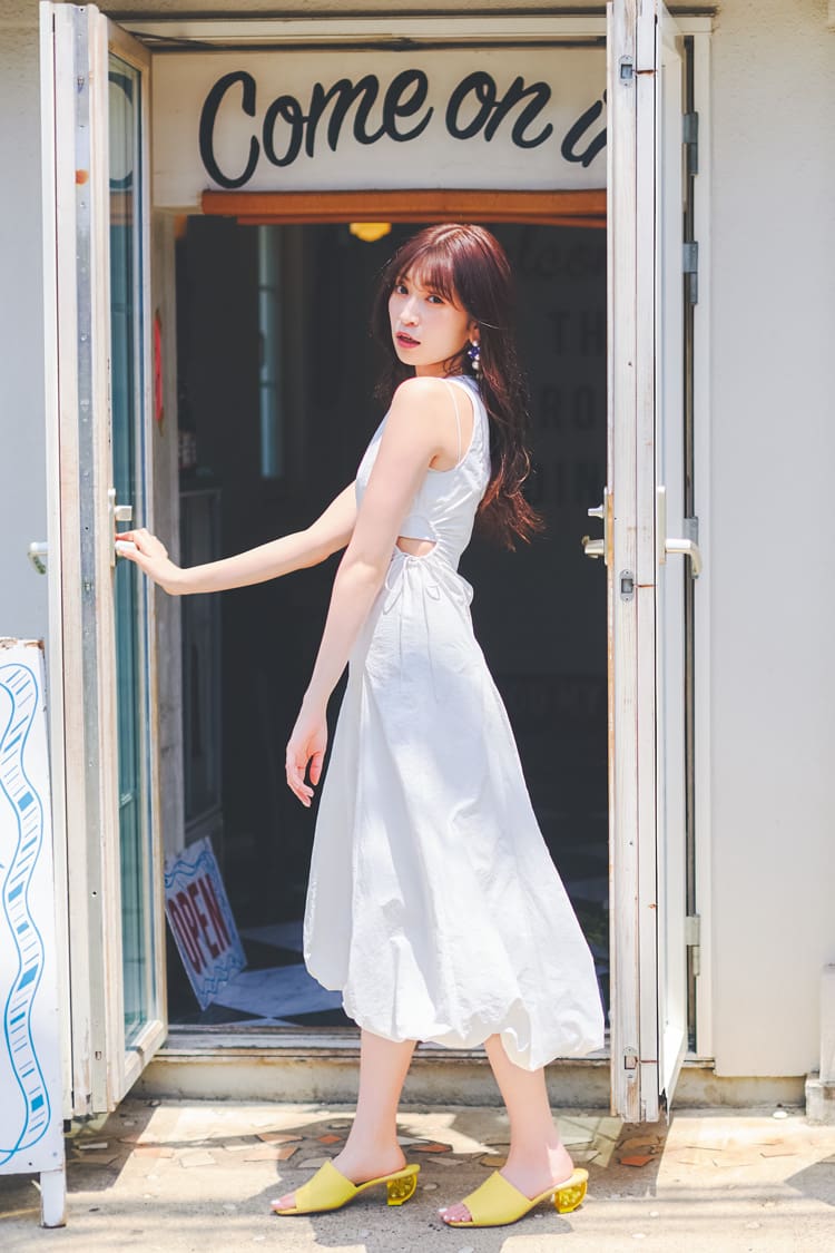 白ウエストカットワークワンピース 20,900円/eimy istoire LUMINE EST新宿店 ピアス 28,600円、イエローサンダル 34,100円/ともにkate spade new york(ケイト・スペード カスタマーサービス) インナー/スタイリスト私物 撮影/遠藤優貴 スタイリング/稲葉有理奈(KIND) ヘア&メイク/megu(岡崎、村瀬分)、RIKO(KIND・吉田分) モデル/岡崎紗絵、吉田朱里、村瀬紗英 (以上本誌専属) 文/小田和希子