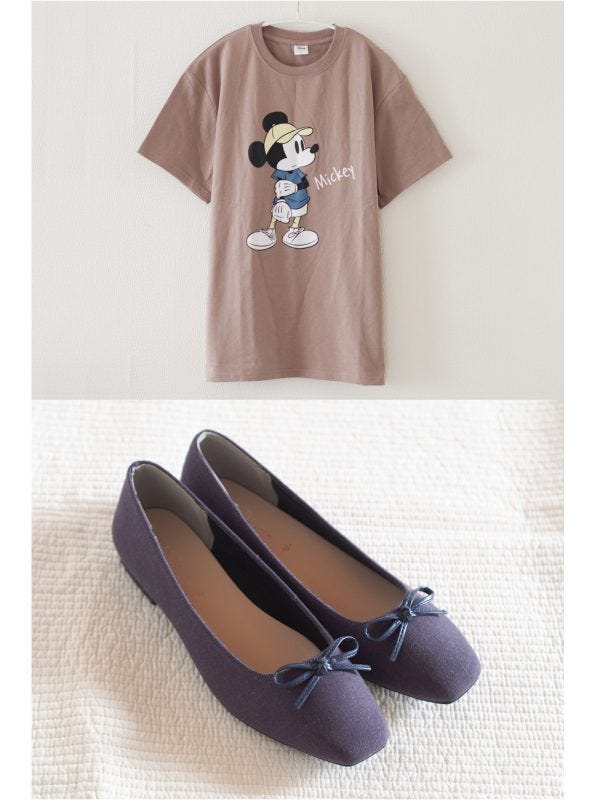 ミッキーのTシャツは、しまむらグループ70周年感謝祭の特価商品。メンズ商品なのですが大きすぎることはなく、程良いゆとりのあるサイズ感。