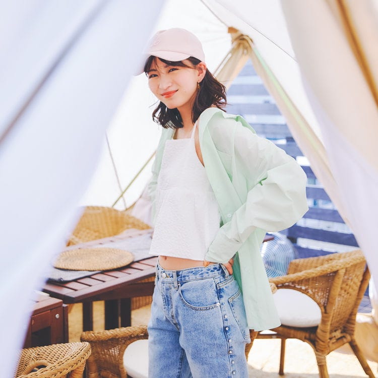 白キャミソール 4,400円/Ray Cassin(レイカズン) ビジューデニムパンツ 12,880円、キャップ 3,980円/ともにépine イヤリング 1,760円/アネモネ(サンポークリエイト) グリーンサンダル 9,900円/rienda(バロックジャパンリミテッド) グリーンシャツ 11,000円/Darich(YSM) Item3 ロゴタンクトップ