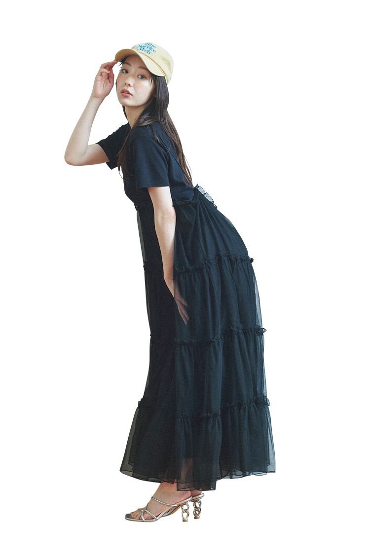 チュールキャミワンピの存在感がバツグンのコーデ。全身ブラックで細見え効果も◎。あえてのキャップで親しみやすさもプラス♡ 素材にこだわってガーリーな雰囲気をまとって!