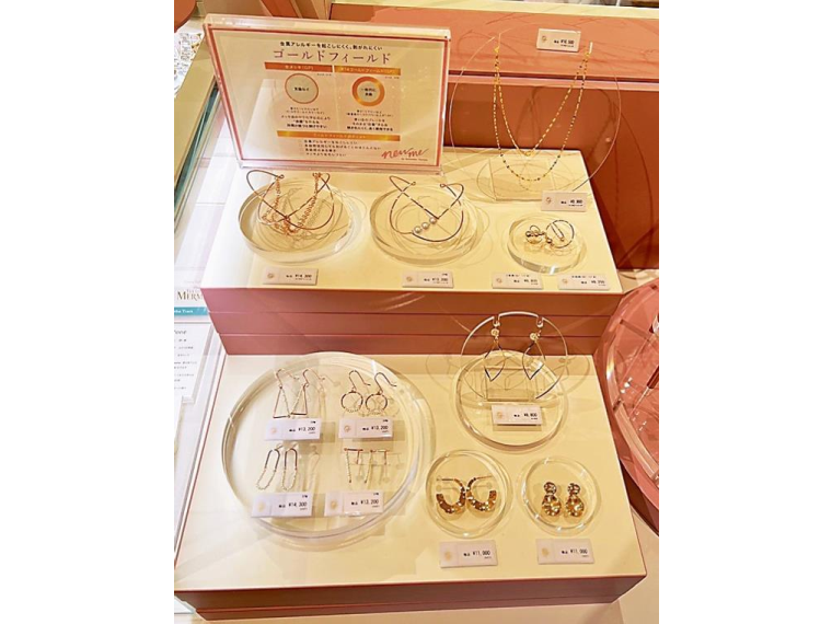 商品は金属アレルギーを起こしにくくはがれにくい14Kゴールドフィールドを使用し、シンプルでモダンなデザインが特徴。ひねりやメタル感を生かした繊細さも盛り込んだ。ブランドの強みであるピンクゴールドの素材も重視し、上品で肌なじみが良く、かわいらしくなりすぎない大人の表現を工夫している。カジュアルにコーディネートできるのもポイントだ。価格帯はピアス8000円から、ネックレス、リングで1万円から。