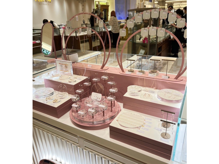 新ブランドはブライダル需要に依存しがちだったジュエリーの企画内容を改め、日常的に身に着けられる〝パーソナルジュエリー〟を中心としたコレクション。ジュエリーはGケースに入れて見せるのが一般的だが、来店客がジュエリーを装着した様子を立体的に体感できるよう、1万円前後のアイテムを中心にGケースに入れない商品陳列を増やした。また、これまで什器は白がベースだったが、ピンクなど商品が映える色の什器を取り入れる。「サマンサタバサ」を軸に自社の2ブランド以上を集積した複合店舗ではタワー什器なども導入するほか、天井からつるすブランドサインも使用する。