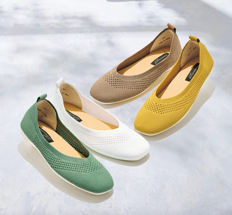「レディースニットフラットシューズ」通常価格1,518円→応援価格1,078円/サイズ:22.5~24.5cm/カラー:ホワイト、ミント、イエロー、オーク 通気性の良いニット素材だから、暑い日も快適に過ごせるフラットシューズです。超軽量でノーストレスな履き心地とかわいさを両立し、毎日履きたくなります。